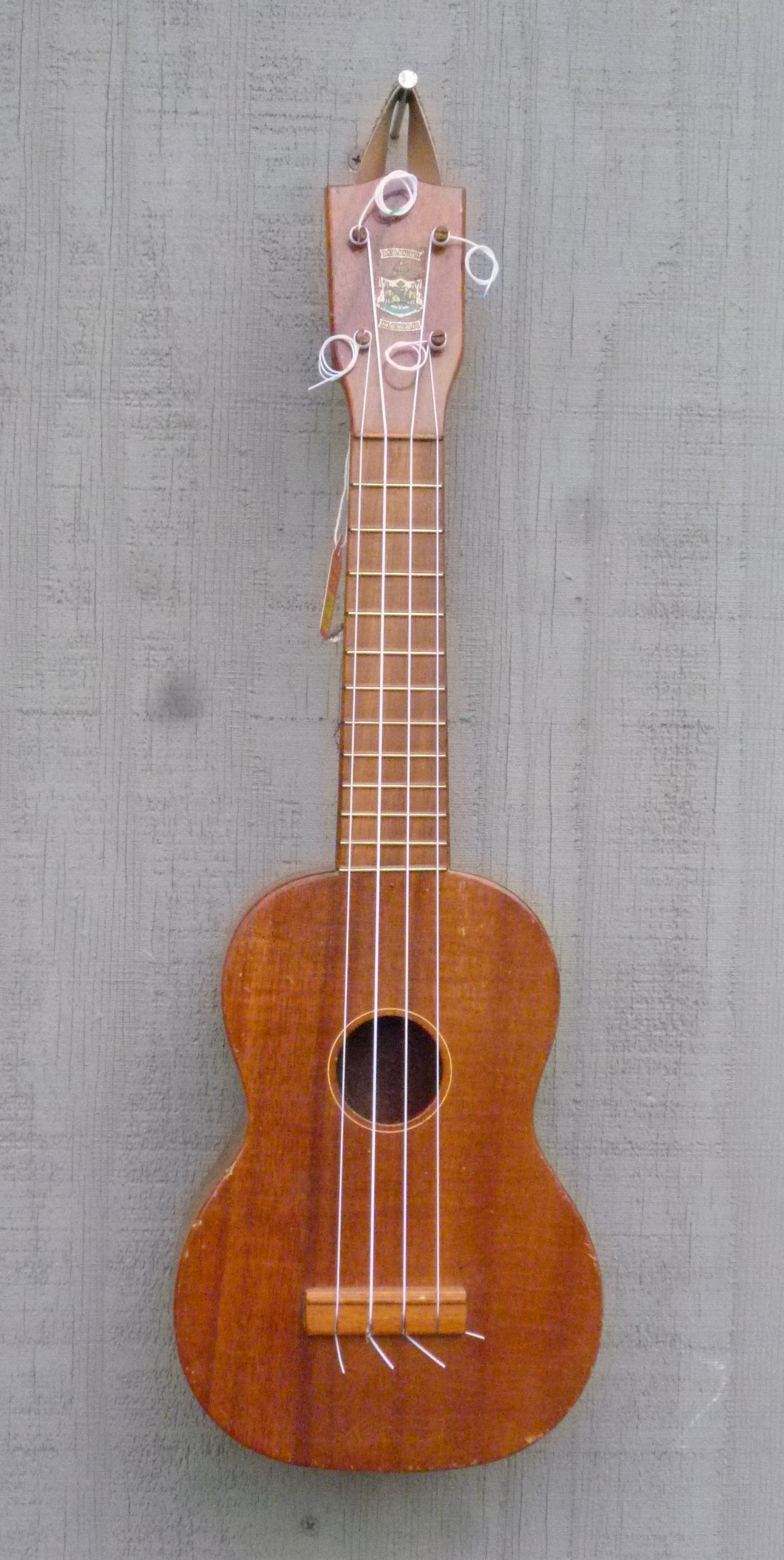 ![]() | ![]() | Makini Soprano Ukulele, 1930s, Island made. Bright, live tone. Original friction pegs. Old refinish; cracked rib repaired our shop. With nice old school gator-skin chipboard case. SOLD.