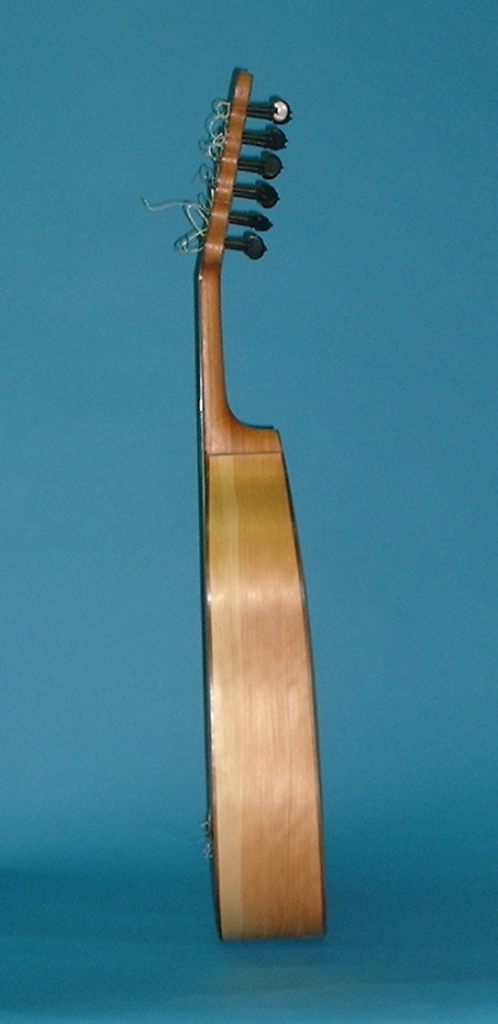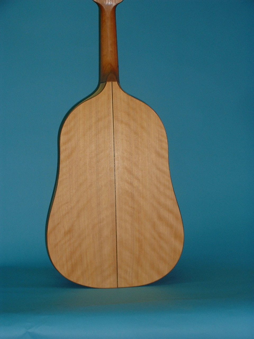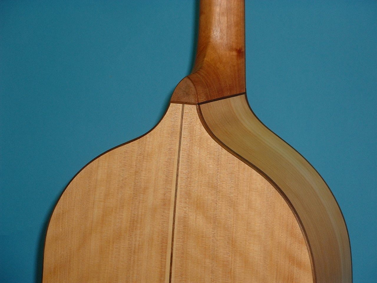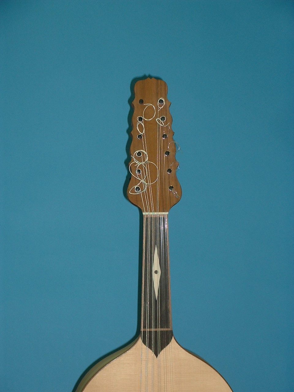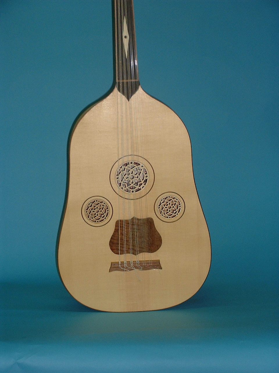 A copy of a 19th century Maltese instrument made by me in collaboration with Phillippe Jannsens, an oud player who wanted an instrument that wasn't so hard to reach around. Body of Monterrey Cypress, Englemann spruce top, Spanish cedar neck. Rosette, fingerboard inlay and peghead carving by Phillippe. Tuned and played like an oud.