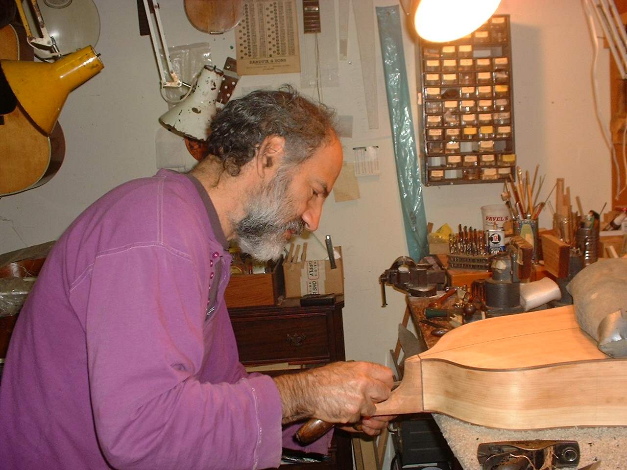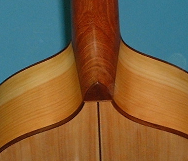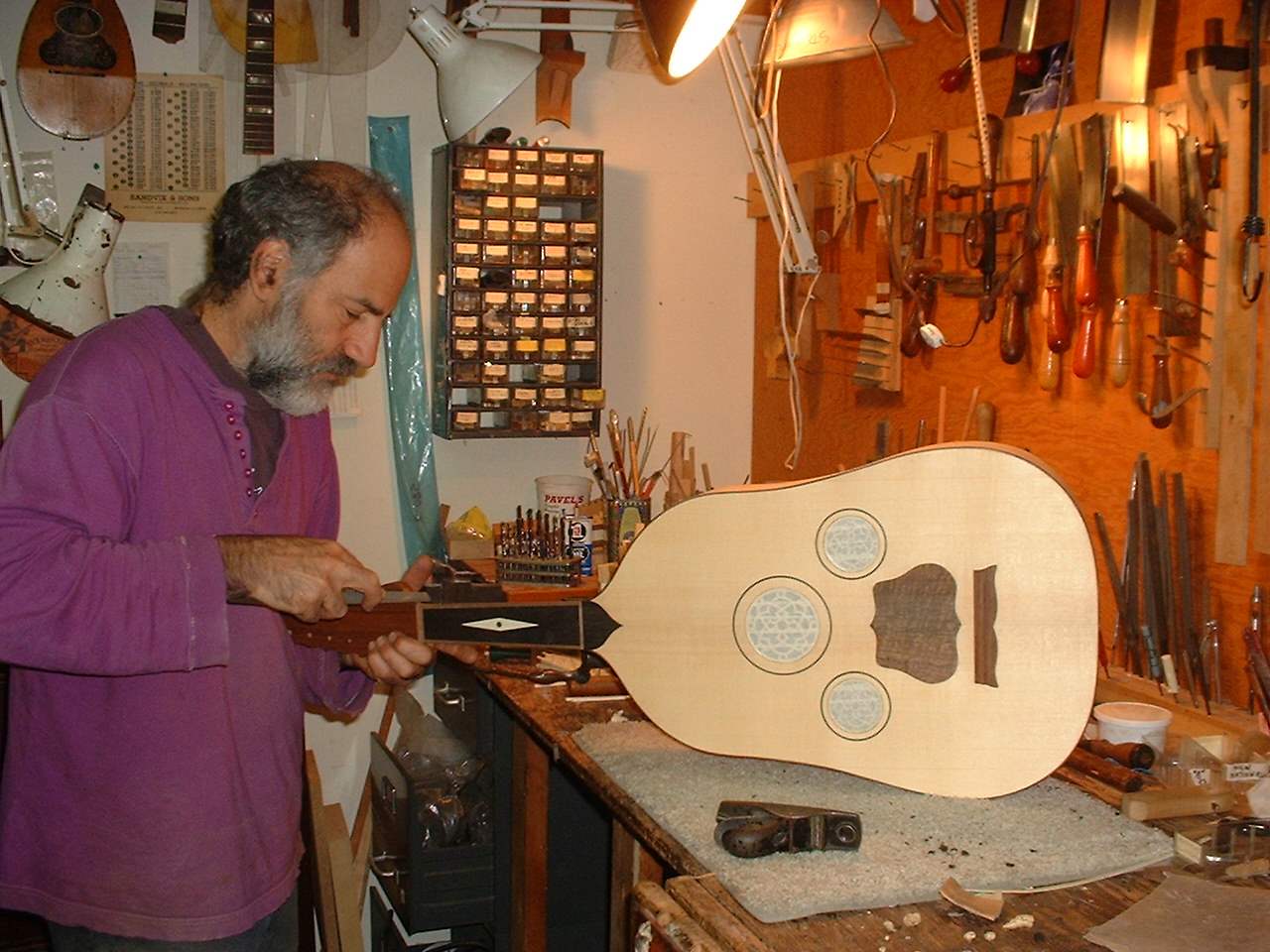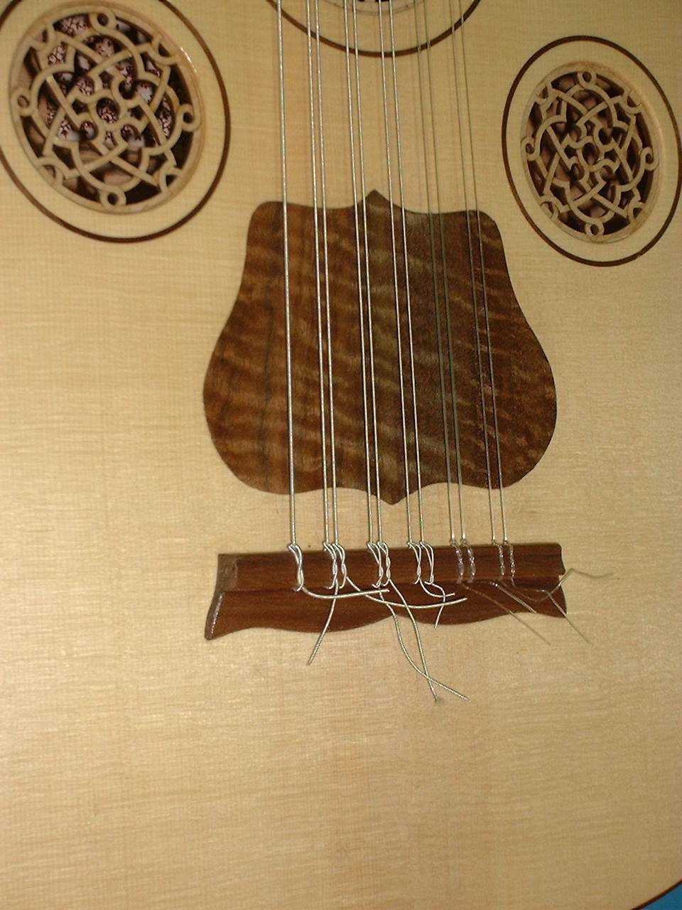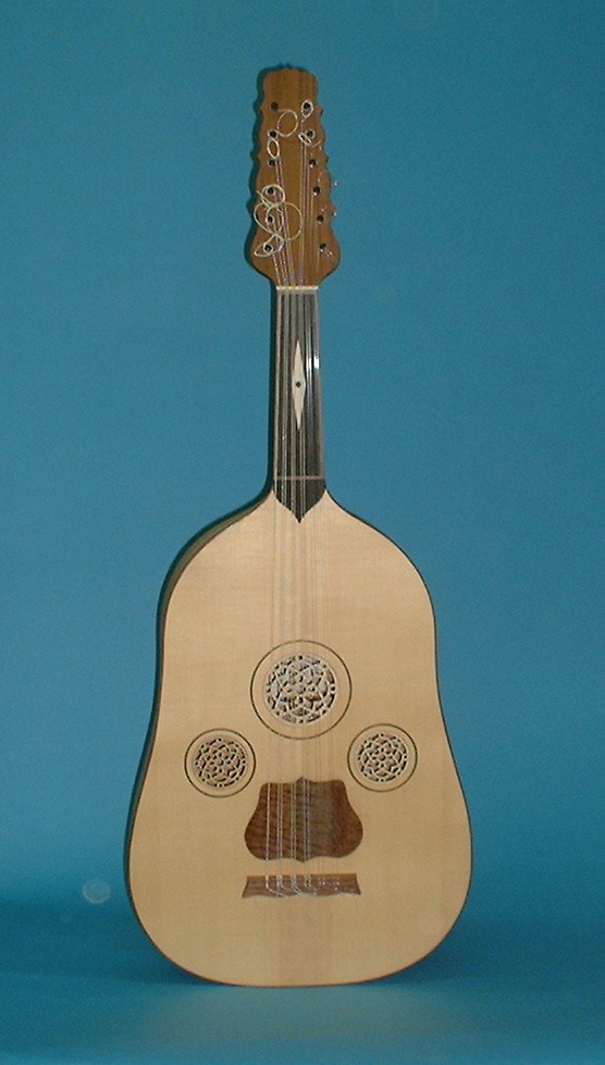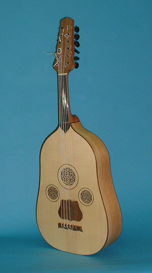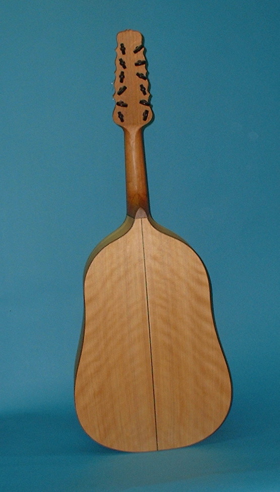 A copy of a 19th century Maltese instrument made by me in collaboration with Phillippe Jannsens, an oud player who wanted an instrument that wasn't so hard to reach around. Body of Monterrey Cypress, Englemann spruce top, Spanish cedar neck. Rosette, fingerboard inlay and peghead carving by Phillippe. Tuned and played like an oud.