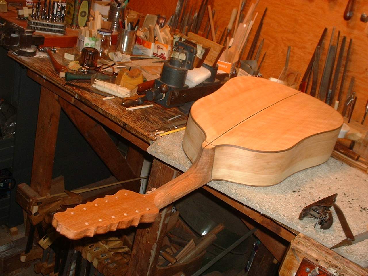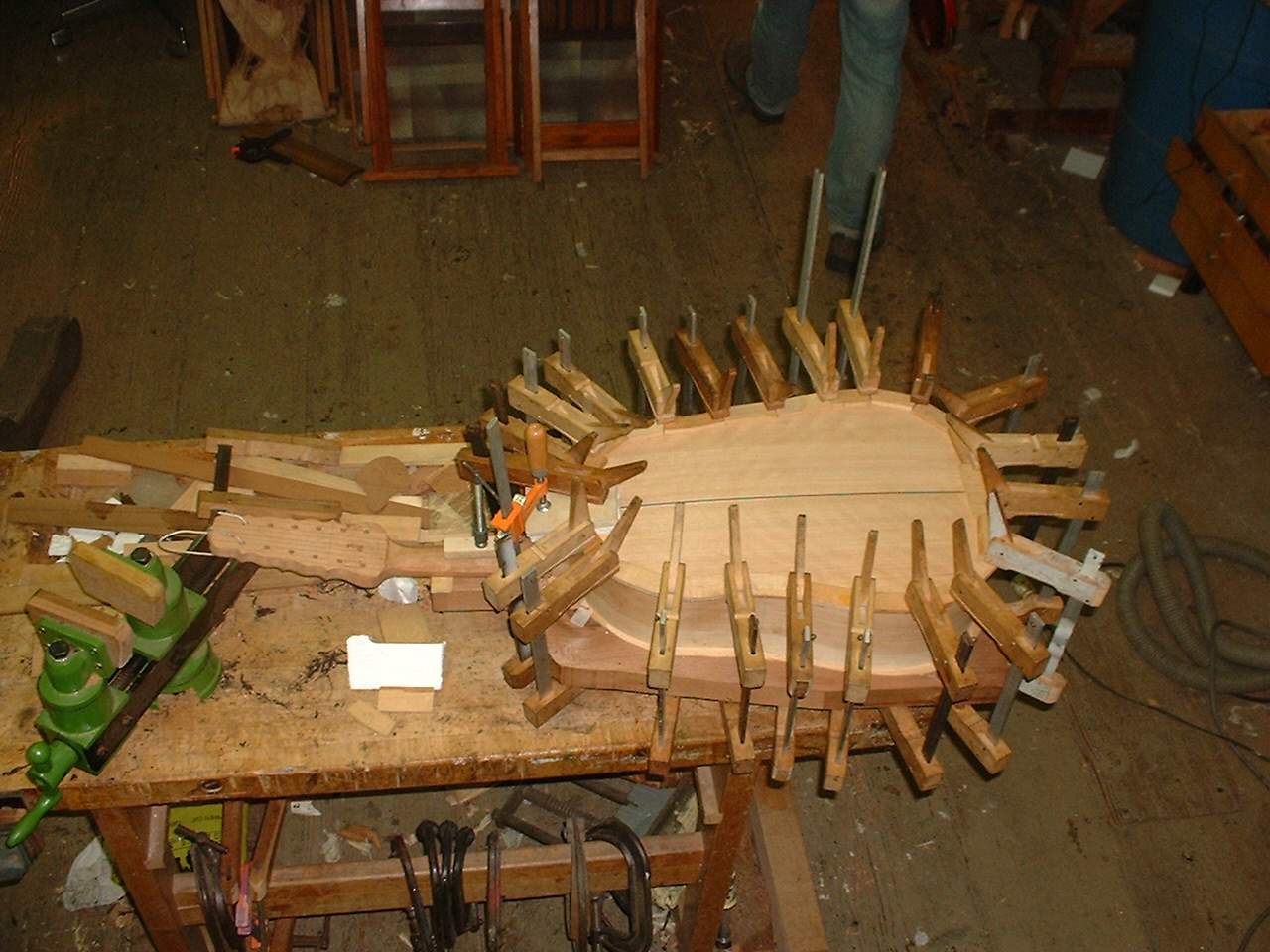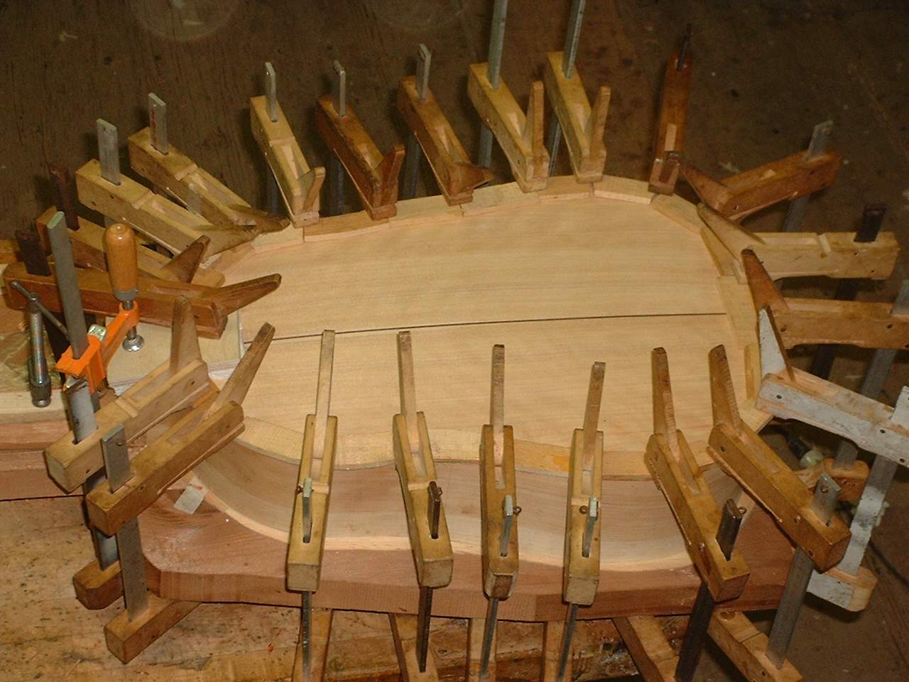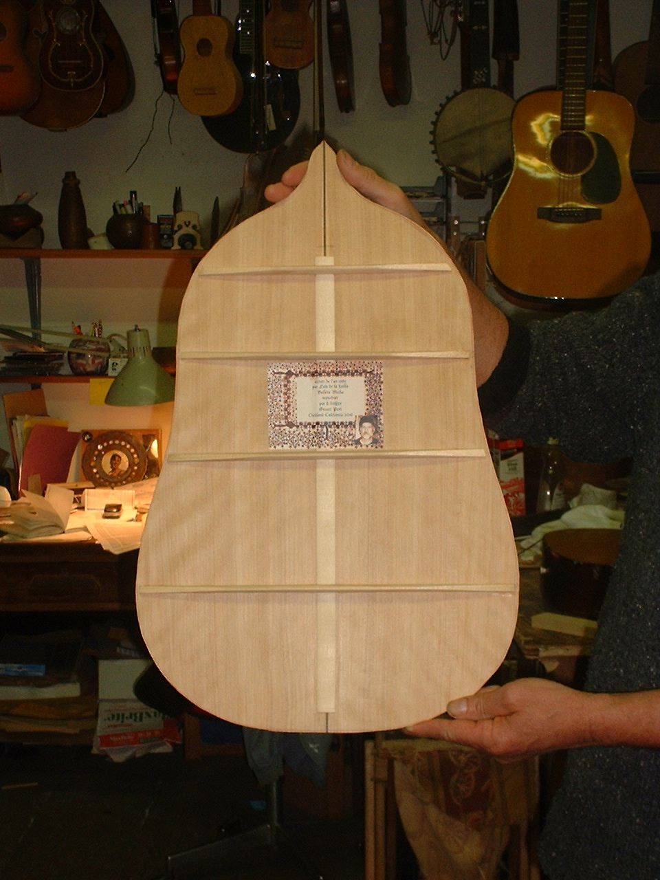 A copy of a 19th century Maltese instrument made by me in collaboration with Phillippe Jannsens, an oud player who wanted an instrument that wasn't so hard to reach around. Body of Monterrey Cypress, Englemann spruce top, Spanish cedar neck. Rosette, fingerboard inlay and peghead carving by Phillippe. Tuned and played like an oud.