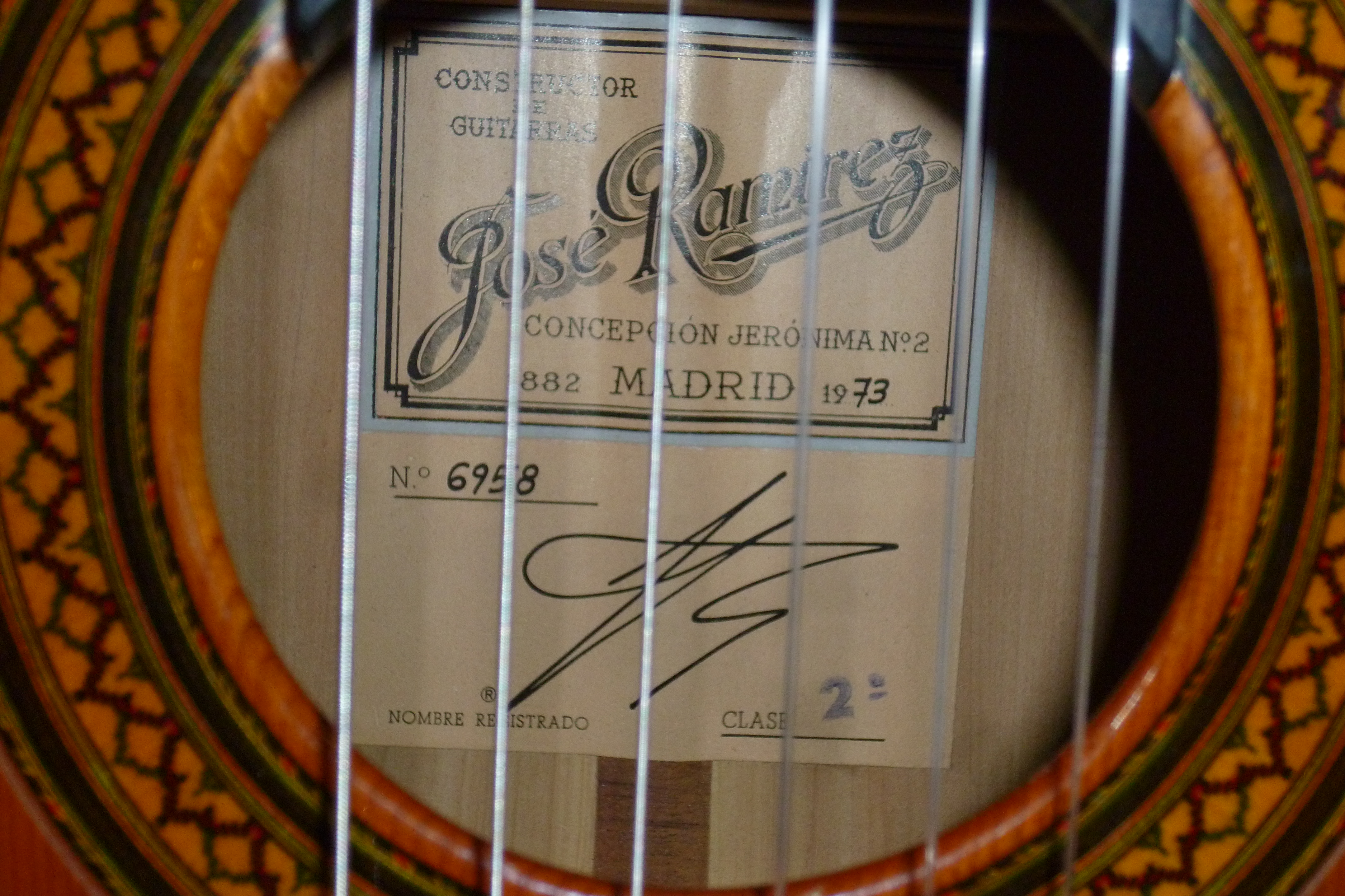 Ramirez 2a Flamenco Guitar, 1973."Segunda" or Studio grade instrument, made under the eye of the master, but more of a team effort than the signed instruments. Cedar top, Cypress back and sides, 655mm scale. Friction pegs. With Golpeador. Very clean. all original condition. SOLD